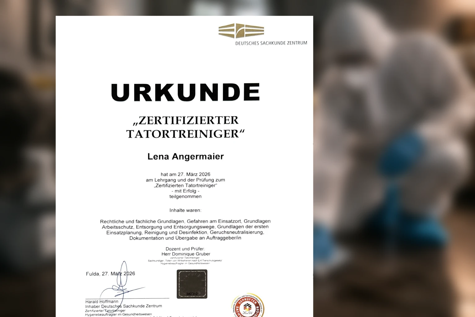 Um diesen besonderen Anforderungen gerecht zu werden, hat sich Lena Angermaier im Bereich Tatortreinigung zertifizieren lassen. Die Schulung und Prüfung umfassten unter anderem rechtliche und fachliche Grundlagen, Gefahren am Einsatzort, Arbeitsschutz, Entsorgungswege, erste Einsatzplanung, Reinigung und Desinfektion, Geruchsneutralisierung sowie Dokumentation und Übergabe.